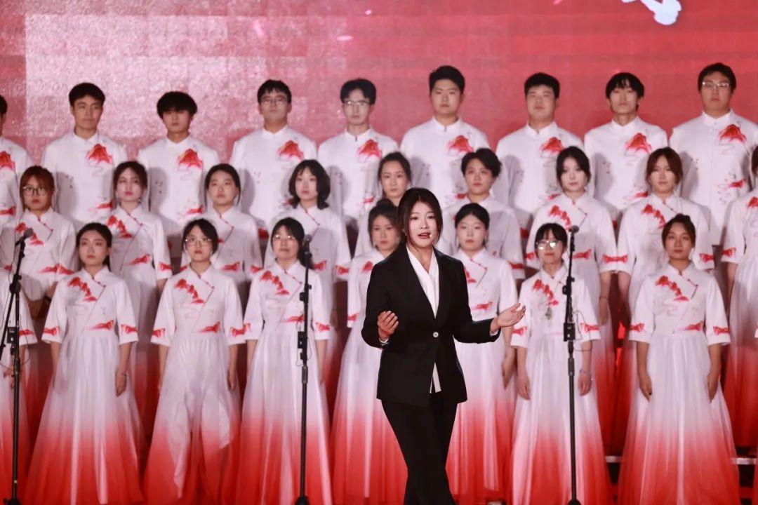 之后,朱世杰和张影函以朗诵开篇,文发学子以昂扬的精神面貌演唱了《天耀中华》,用青春之声传递着对五四精神的礼赞与传承,整齐的歌声、饱满的激情,充分展现了学院师生心系祖国、志存高远的精神追求,同时也表达了对伟大祖国的深情祝福和对中华民族伟大复兴的坚定信心。