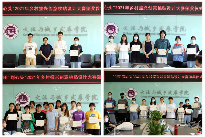 2021年6月30日,由校团委联和文发学院举办的“‘田’到心头”乡村振兴创意桃贴设计大赛颁奖仪式在文发楼322室举行。文发学院院长韩芳、副书记副院长李云乐、农村区域发展系主任苟天来、指导老师常丽红、团委书记周旭平出席活动,各位获奖同学参加了本次活动。