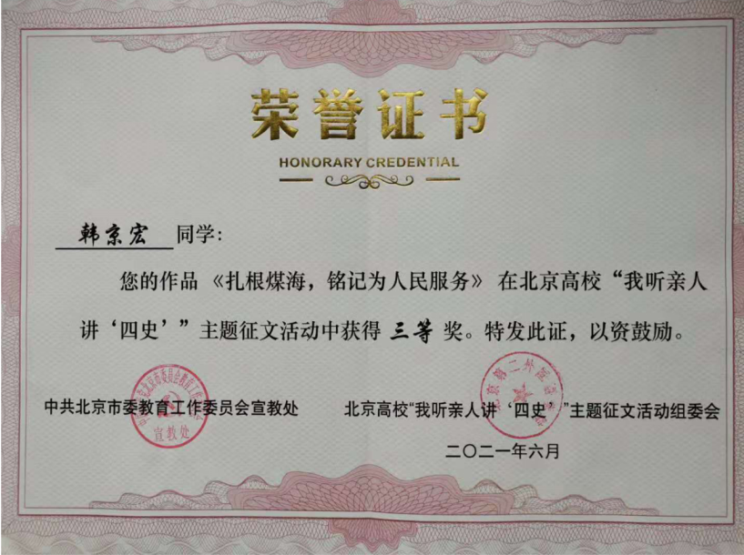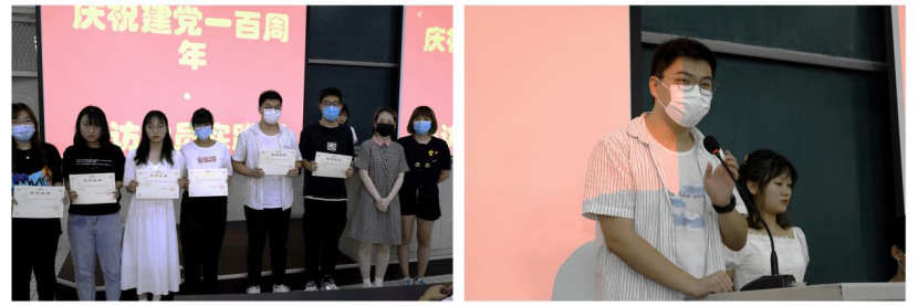最后为庆祝建党一百周年·采访党员实践活动的获奖学生颁奖。韩京宏同学作为代表进行了发言,他谈到今年是中国共产党成立一百周年,党的历史是指导我们前进的方向与动力。每一位党员都是一部浓缩的党史,做好采访老党员工作,就是我们学习党史的生动实践,他的作品《扎根煤海,铭记为人民服务》获得了北京高校“我听亲人讲‘四史’”主题征文活动三等奖。