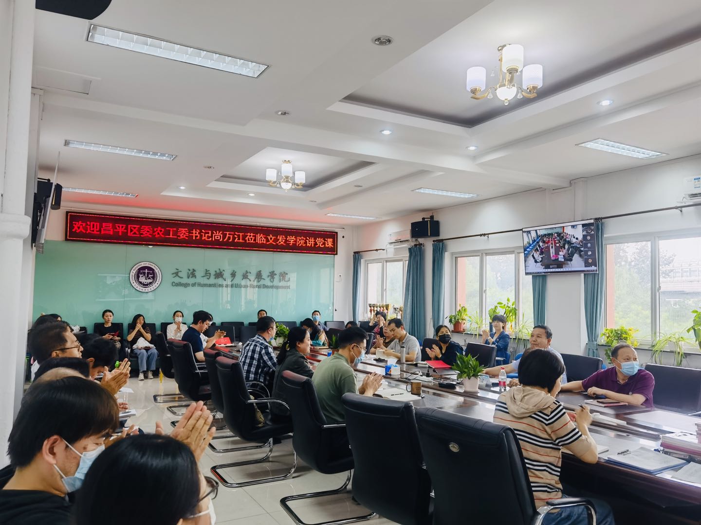 为庆祝中国共产党成立100周年,牢记初心使命,传承红色精神,开展好党史学习教育,2021年5月26日下午文发学院党总支邀请到了昌平区委农工委书记尚万江为学院全体师生讲授党课。会议由韩芳院长主持,采取线上线下相结合的方式,共有50余名教职员工和120余名学生聆听了讲座。