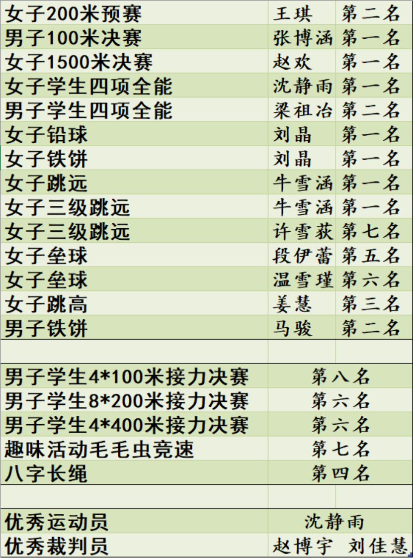 在本次运动会中,沈静雨同学被评为优秀运动员,赵博宇、刘佳慧同学被评为优秀裁判员。感谢运动员们两天的辛苦比赛,为我院增光添彩!