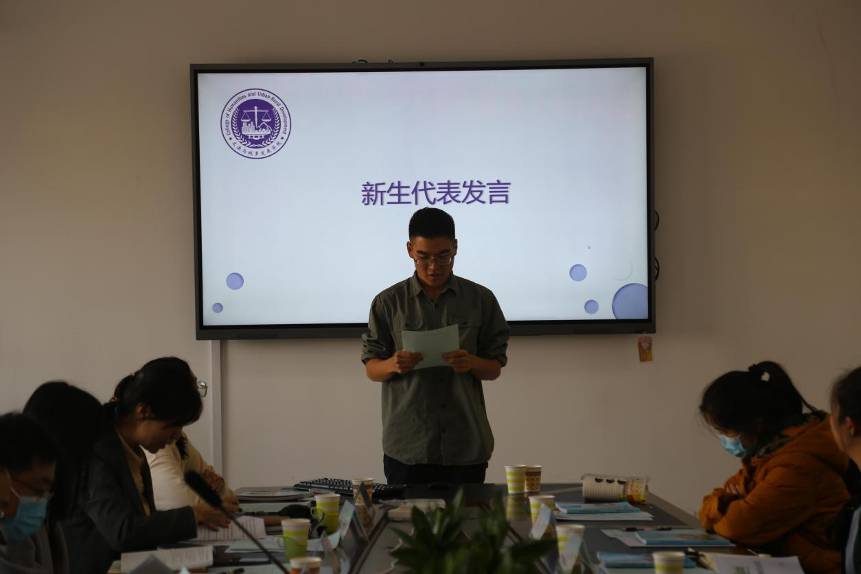 会议第三项,新生代表旅管二班班长郑舜天同学进行了发言,他表示了自己对大学生活的憧憬,也谈到了作为班长如何开展班级建设,对学校配备第二班主任也表示了感谢,期待在两位班主任的带领下,大学生活会充实有意义。