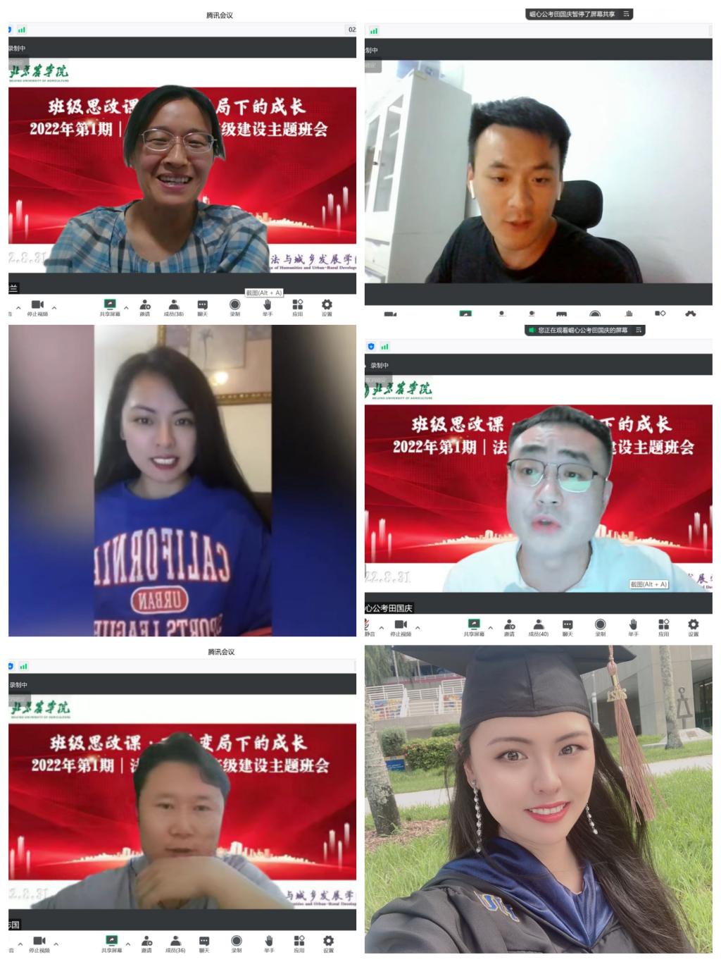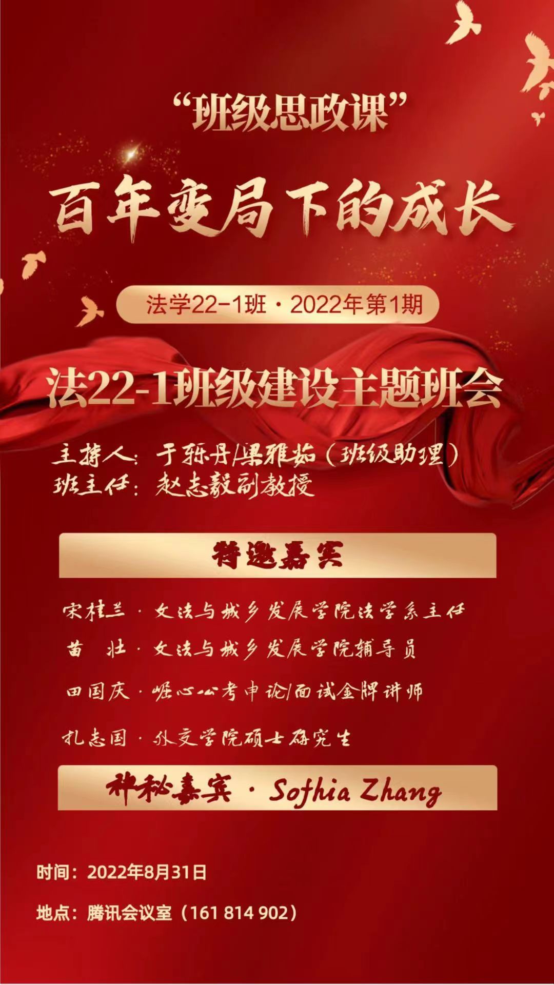 丹桂飘香时,萌新入校园。为加强师生交流,充分发挥朋辈引领作用。8月31日晚,文发学院2022级法学1班举办班级建设主题班会。法学系主任宋桂兰、 班主任赵志毅、新生辅导员苗壮参加班会。2013级法学2班田国庆、2017级法学2班扎志国、2005级法学春季班张慧(Sophia Zhang)作为特邀嘉宾参与分享。会议通过腾讯会议线上举办。