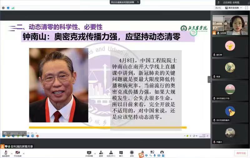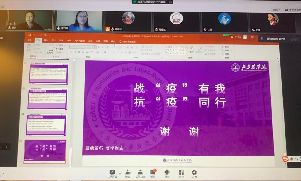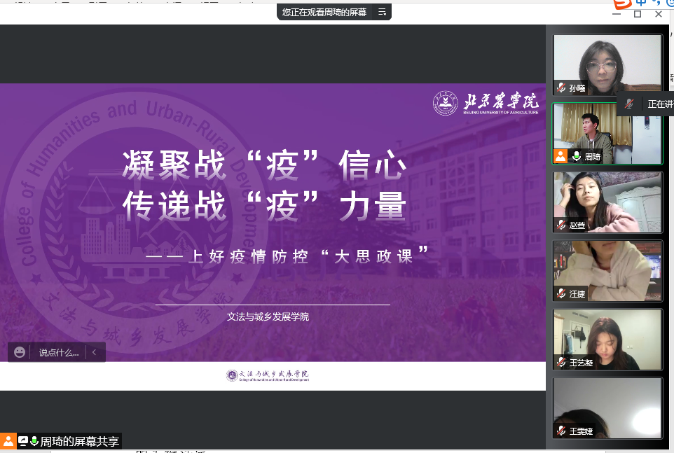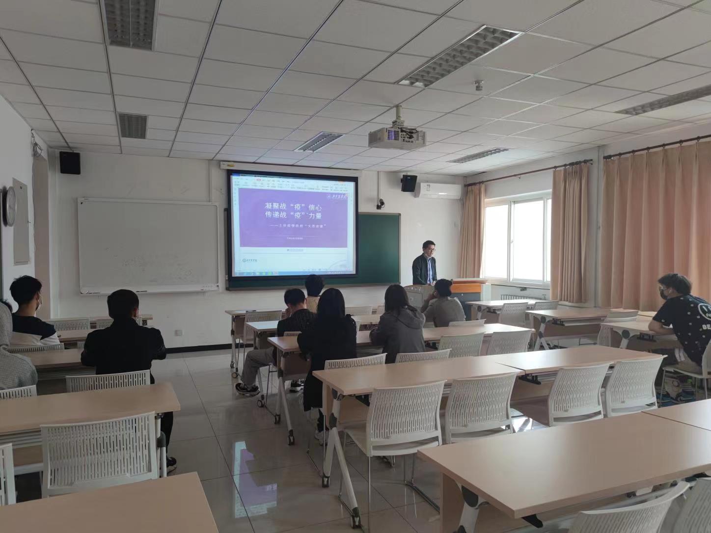 2022年4月28至29日,文发学院各班班主任、第二班主任及辅导员通过线上主题班会形式,为学院全体学生讲授疫情防控“大思政课”,院团委书记周旭平为在校学生线下授课。韩芳、孙曦等老师以第二班主任身份在线上会议室与同学们亲切交流。