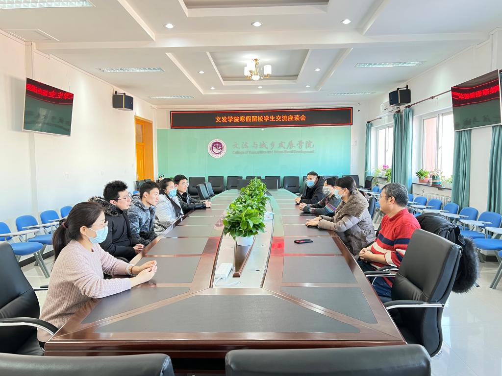 之后,学院领导与寒假留宿学生一同来到文发楼322开展座谈交流会。了解留校学生的生活及家乡疫情情况,叮嘱研究生做好论文进度和就业工作安排,本科生利用假期,提前做好考研和就业准备,提醒大家做好防护,注意个人安全,遵守学校的疫情防控政策,有困难随时与老师联系,同时假期也要养成良好的生活习惯,合理安排学习和生活,适度锻炼身体,珍惜假期时间,努力提升自己。最后祝大家度过一个愉快的春节。
