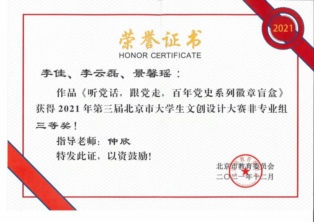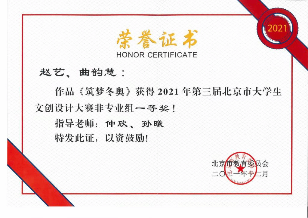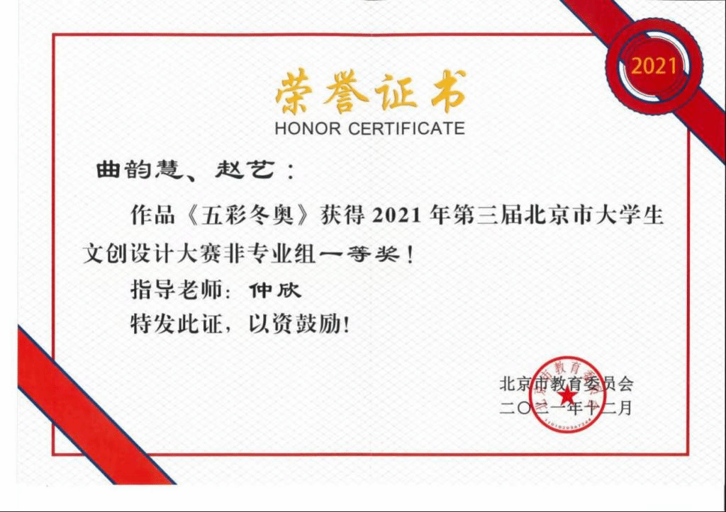 2021年北京市教育委员会举办第三届北京市大学生文创设计大赛落下帷幕。该项赛事旨在通过以东奥为主题的文创作品的创作,充分表达大学生们对冬奥的思考与感悟,用青春视角展现冰雪活力,用艺术形式描绘东奥成就,进一步激发大学生历史责任感和奋斗精神,深刻展现独属于中国青年的冰雪与青春领悟。本次活动设立两个主题赛道,其一为庆祝建党百年,旨在通过创作以党建为主题的文化创意作品,充分表达大学生对党的感激和热爱,从青年的角度展示百年历程,用艺术语言描述辉煌成就,进一步激发大学生的历史责任感和奋斗精神。其二为办好北京冬奥会、冬残奥会,通过冬奥主题的文创设计作品的征集,激发在校大学生爱国热情,领悟冬奥精神,让作为文化载体的文创产品成为我国冬奥会最好的名片。