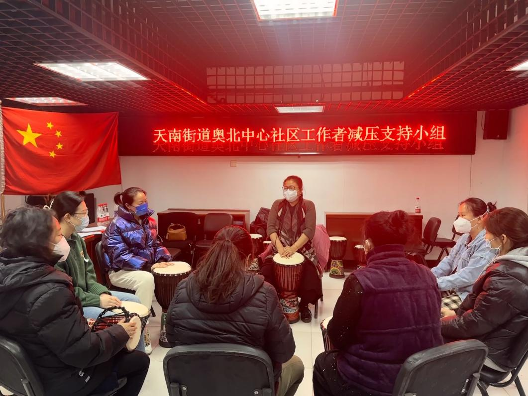 为了缓解社区工作者们的情绪、释放繁杂工作所带来的压力,合理调整自己的工作状态,3月15日下午,3044永利集团社会工作专业师生携手昌平区天通苑南街道社会心理服务中心在奥北中心社区开展了第三次社区工作者减压支持小组。在小组活动中,社会心理服务中心的于凤英老师为大家带来了“鼓圈--音乐治疗”的团体活动。