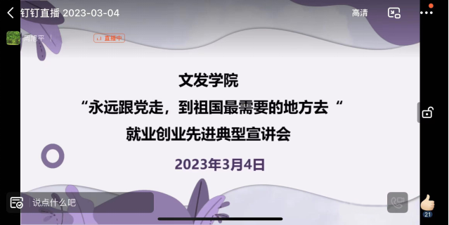 为深入学习贯彻党的二十大精神,落实党中央、国务院关于“稳就业”“保就业”的决策部署,按照教育部《关于开展2023届高校毕业生春季促就业攻坚行动的通知》和学校2023年就业工作会的部署要求,促进2023届毕业生积极就业、到基层就业、到祖国最需要的地方就业,文发学院于2023年3月4日晚7点线上举办就业创业先进典型宣讲会。6名来自三支一扶、选调生、西部计划、乡村党建工作岗位的往届毕业生主动分享他们选择基层就业的原因,以及相关备考事项。并就工作感受与参会学生进行了深入的交流。