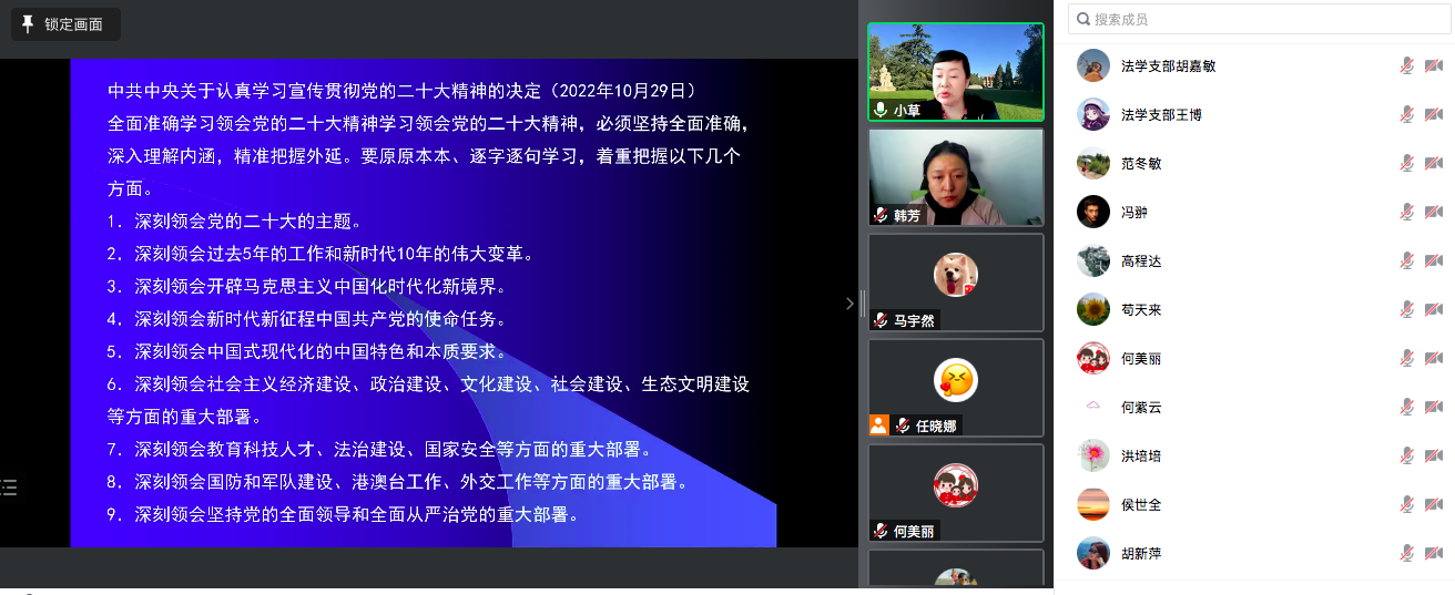 为认真学习宣传贯彻党的二十大精神,落实教职工政治理论学习日制度,11月30日下午,文发学院邀请中央党校(国家行政学院)经济学部副主任、教授,博士生导师曹立解读党的二十大报告,会议采取线上方式进行。学校党委常委、纪委书记李伟书列席,学院全体教职工,学生党员、入党积极分子等200余人参加,文发学院院长韩芳主持本次讲座。