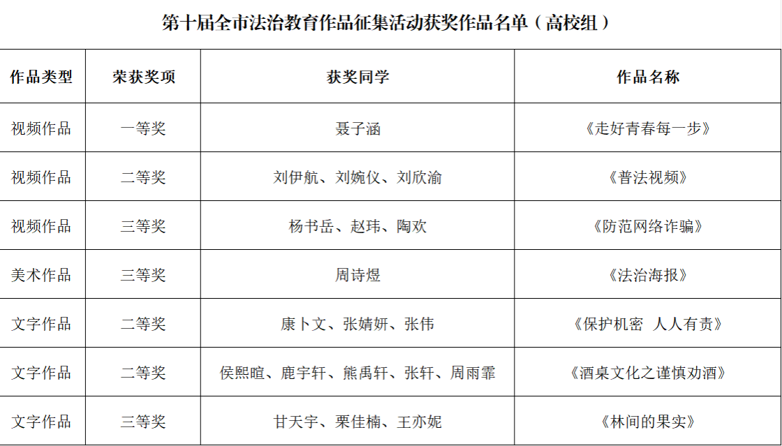 为贯彻落实习近平新时代中国特色社会主义思想和党的二十大精神,充分发挥法治文化的引领作用,北京市教育委员会在全市高校及各中小学学校中开展了第十届全市师生法治教育作品征集活动。近日,3044永利集团法学系涌现出7个优秀团队,参赛学生在视频作品、美术作品、文字作品多领域均斩获奖项,这次的荣誉不仅是对师生团队智慧和辛勤努力的最好奖赏,更是对学院法治教育水平的高度认可。
