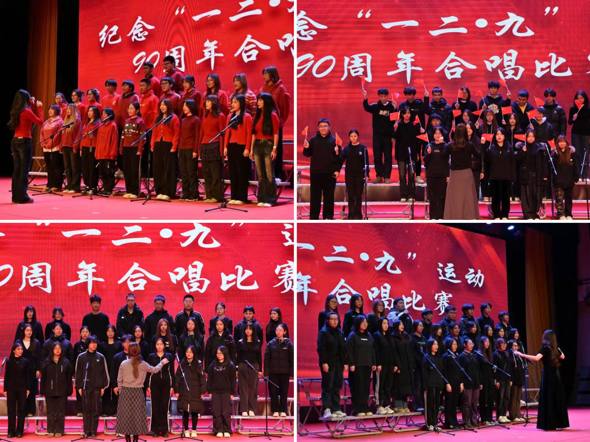 纪念“一二·九”运动90周年合唱比赛随即拉开帷幕,各参赛班级以饱满的热情和精湛的演绎,为现场师生呈现了一场精彩的视听盛宴。《国家》《我和我的祖国》《保卫黄河》等经典歌曲接连唱响,用歌声缅怀历史、礼赞时代,将现场气氛一次次推向高潮。