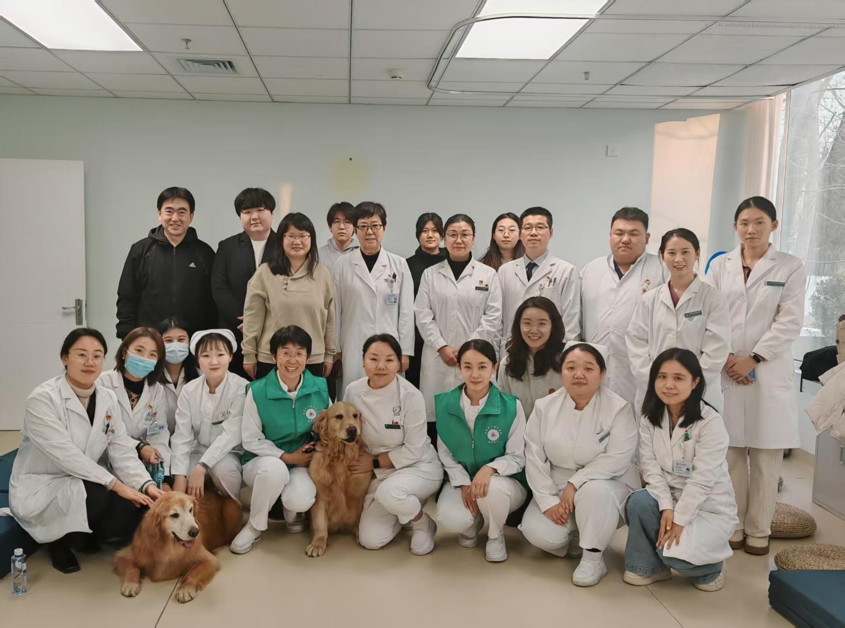 在活动中,小汤山医院副院长王莉教授带领该院医务办公室、护理部、医务社工部、作业疗法康复科、物理疗法康复科、儿童心理干预中心以及中西医结合诊疗科等部门业务骨干参与了全程活动。永利集团3044师生详细介绍了抚慰犬的训练标准与安全规范,并指导小汤山医务人员通过阶梯式互适应体验,亲身感受了抚慰犬带来的平静与专注的氛围,深刻理解了其作为“治疗媒介”在调节治疗氛围、降低烦躁、缓释焦虑情绪等方面的重要作用。